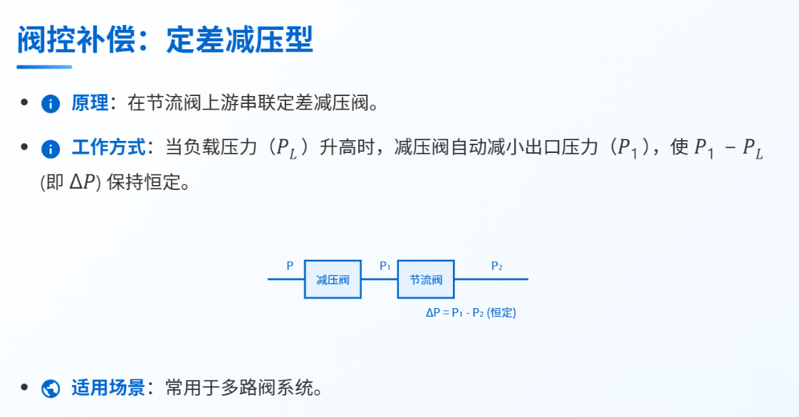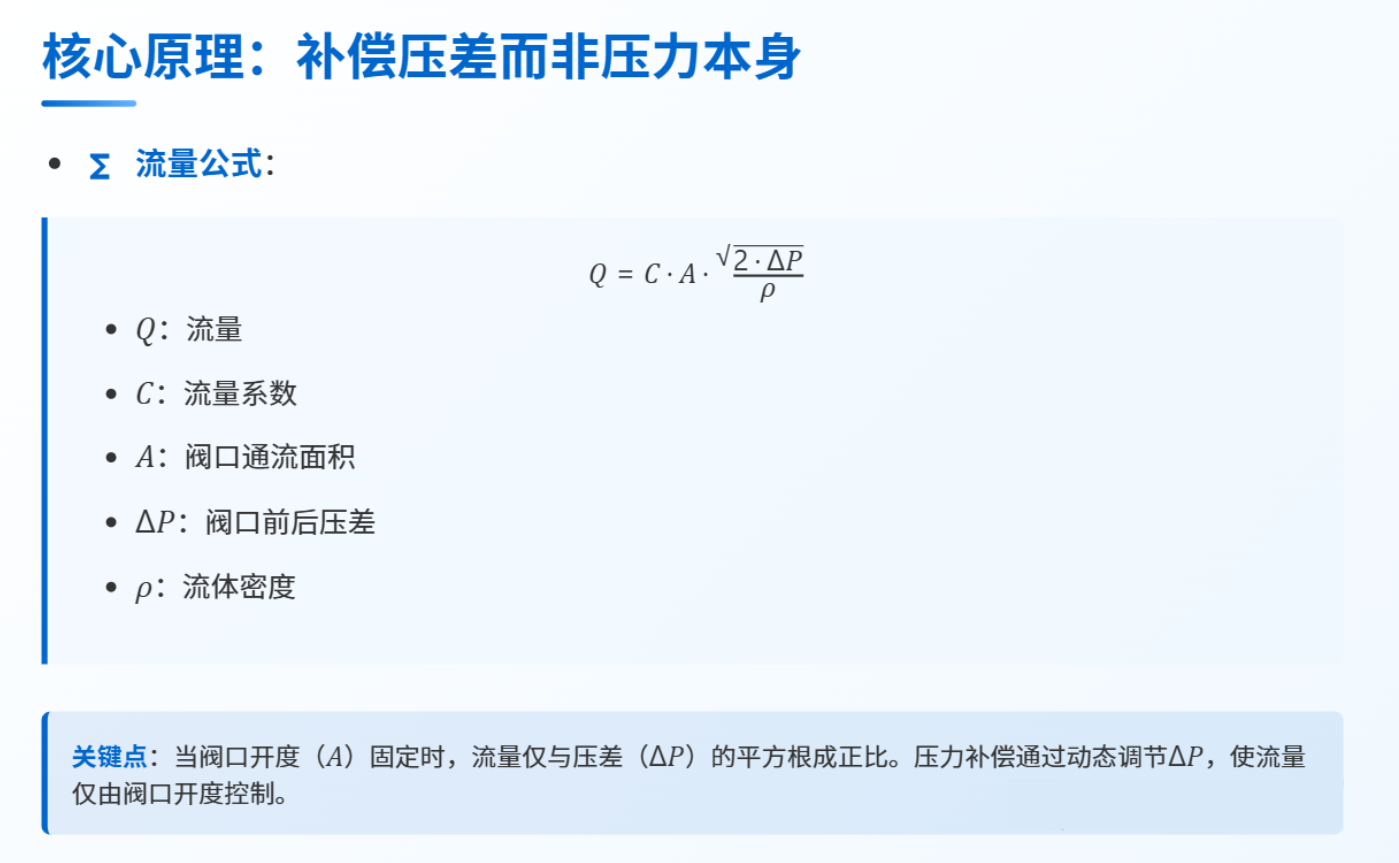 補償壓差而非壓力本身,當閥口開度固定時,流量僅與壓差的平方根成正比