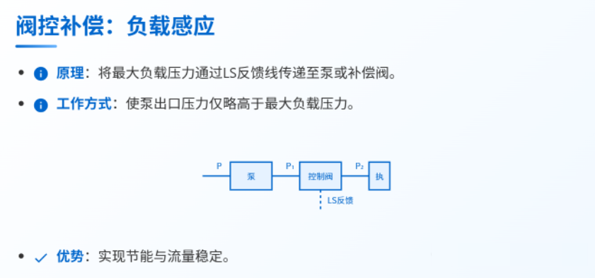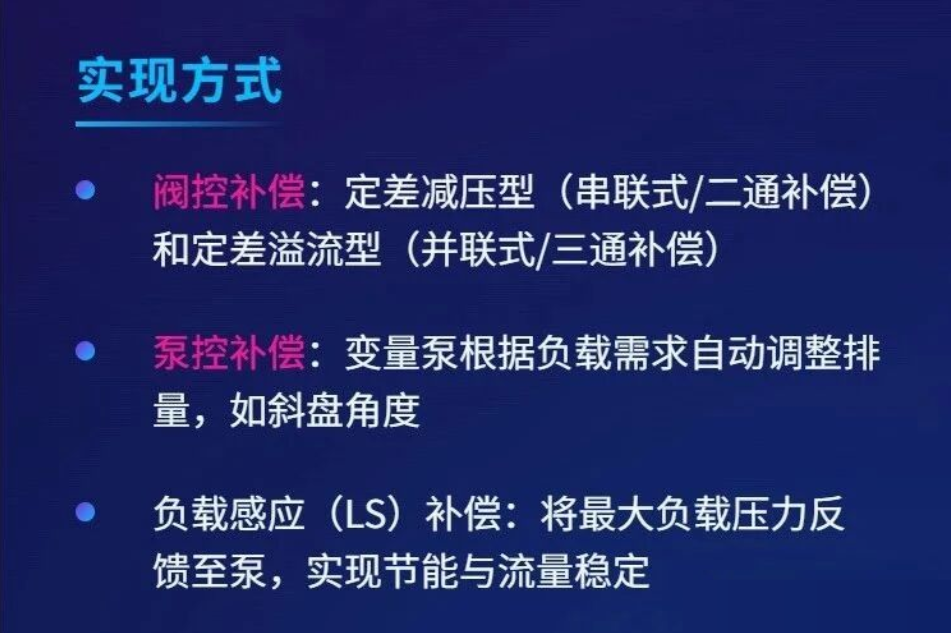 為了解決這一關鍵問題,確保執行元件在負載變化時仍能獲得相對恒定的流量(從而保持穩定的速度),工程師們引入了壓力補償這一核心技術。壓力補償是指液壓系統中采取特定措施,主動抵消或平衡因負載變化引起的壓力波動,從而維持關鍵工作參數(特別是流量)相對穩定的過程和方法。