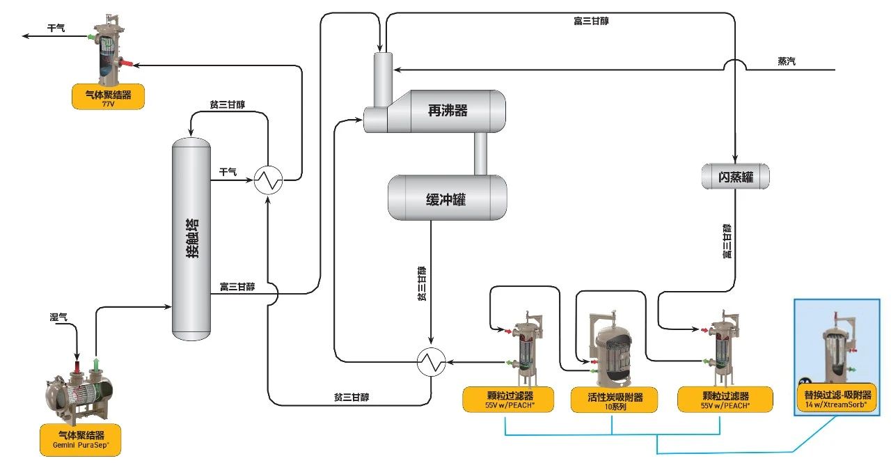 例如,天然氣中的冷凝液、鹽、顆粒等污染物可引起 TEG發泡,不僅導致氣體不合規,含水量超標,露點升高,還會造成大量TEG夾帶;TEG再生回路的過量油液會在塔內沉積,導致再沸器對TEG的實際用量讀數不準;溶解在TEG液體中的鹽會加速火管腐蝕,導致火管故障;懸浮顆粒物含量超出再生標準時,會導致托盤和泵堵塞、過濾器使用壽命縮短等問題……可以說,過濾將對整個脫水工藝的性能將產生直接影響。
