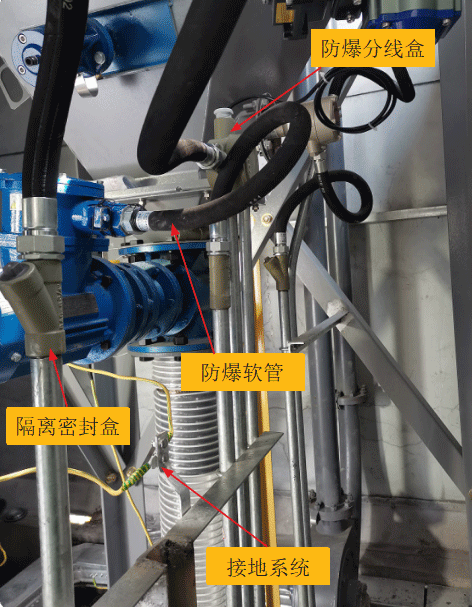 為了消除著火源,團隊對整個系統做了接地和電氣防爆等處理。例如,對MIB主設備殼體、氣包、卸灰和管鏈系統等進行可靠接地;對不銹鋼風管法蘭連接處及除塵軟管增加靜電跨接線。同時,系統不使用任何銅制配件,安裝專用接地網。此外,除塵主控制系統采用正壓防爆柜體,上電前充入隔離氣體,并保證100~200Pa 左右的正壓力;現場布線采用防爆軟管、防爆分線盒和隔離密封盒等措施,特殊地方用密封膠泥封堵等。
