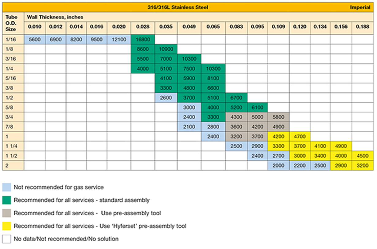 只有當(dāng)儀表管提供徑向阻抗且管材硬度較套圈硬度小時(shí),才能實(shí)現(xiàn)穿透。厚壁儀表管有助于提供阻力,下表提供了一系 列壁厚選項(xiàng),以便安全使用派克管件。藍(lán)色等級(jí)表示直徑和壁厚的組合,此組合不適用于氣體服務(wù)。