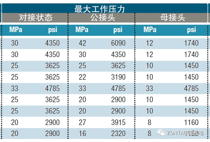 ① 有些快速接頭對接狀態(tài)和斷開狀態(tài)的最大工作壓力不同(兩種狀態(tài)承壓部位不同),選型階段必須核實(shí)斷開狀態(tài)和對接狀態(tài)的工作壓力。