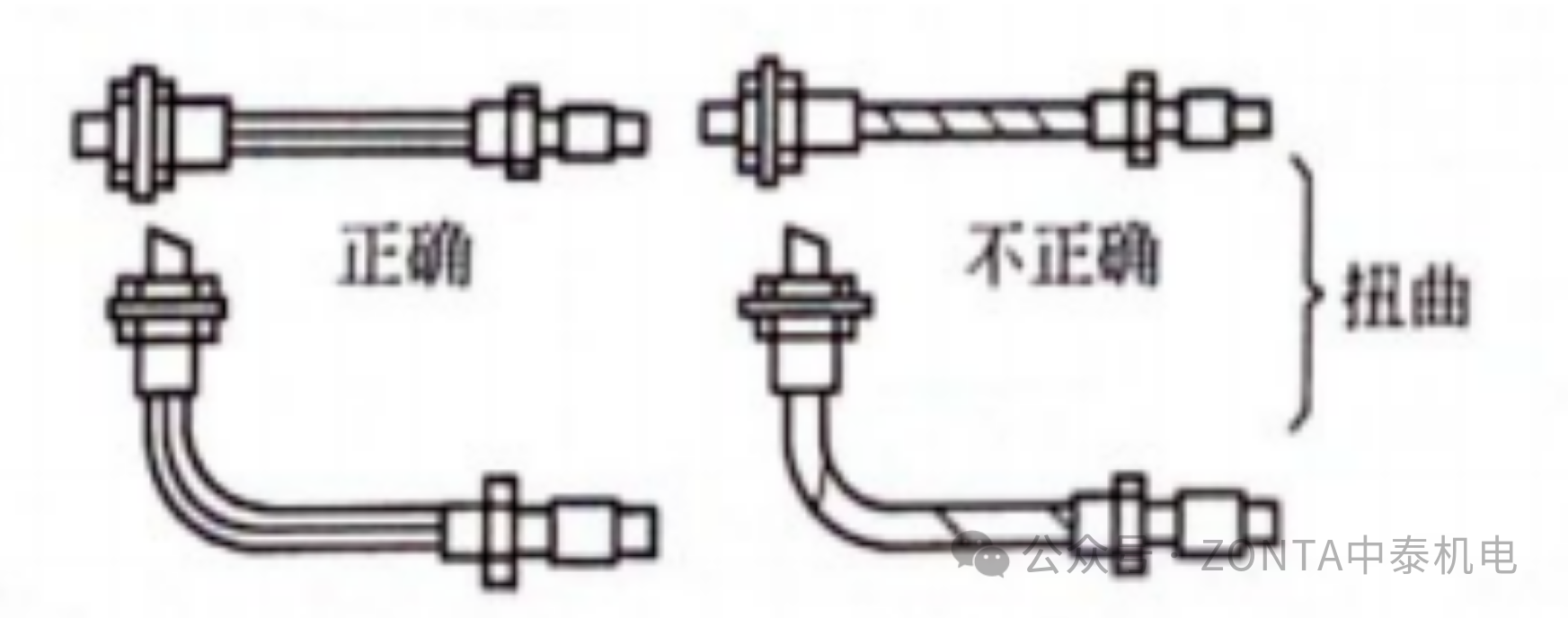6、在直角拐彎處最好不用軟管,否則在壓力交變的工況下,會因軟管彎曲處的長度和曲率半徑的變化而疲勞導致破裂,產生漏油,使用不銹鋼軟管時更應注意。
