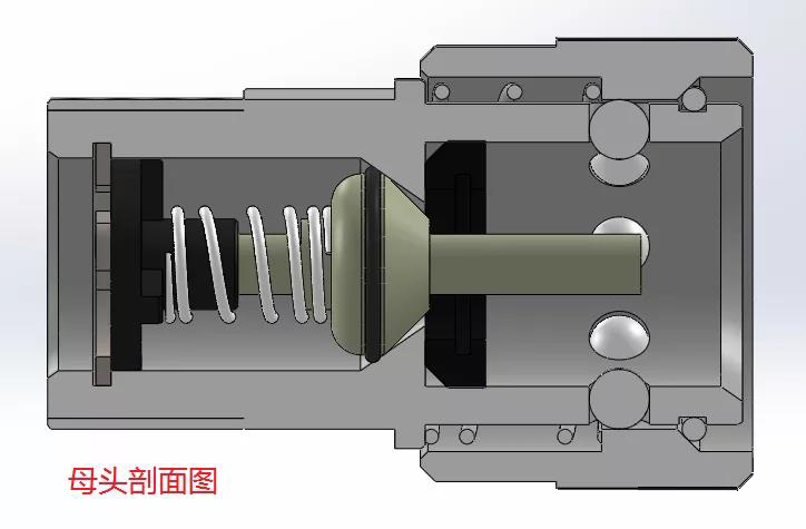 公頭未與母頭裝配時閥芯在彈簧力的作用下保持封閉,管路不通。公頭一般以螺紋連接的方式固定在閥板上,閥板中的螺紋孔需加密封圈保持密封。
