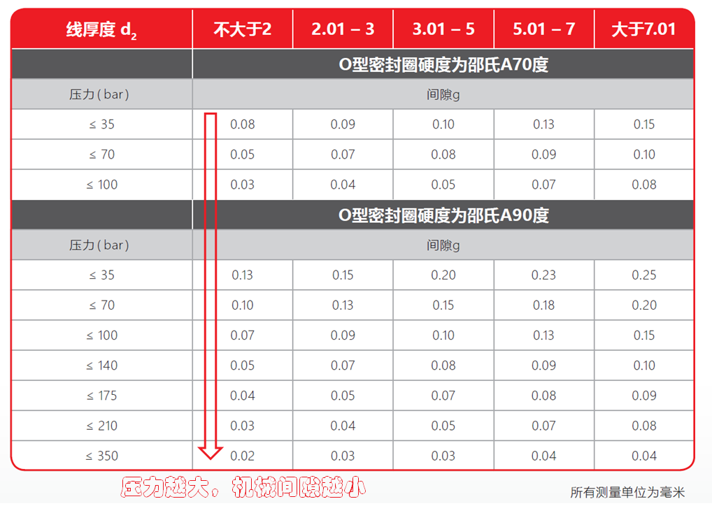 而機械間隙又取決于公差配合的選擇,加工工藝,裝配工藝等因素。除此之外,密封面間隙的壓力也是很關(guān)鍵的因素。下面給出O型圈線徑、所受壓力、機械間隙、硬度四者之間的關(guān)系表,可供設(shè)計時參考。粗略的看,總的設(shè)計原則就是——壓力越大,機械間隙就要越小。