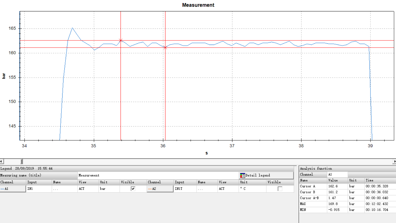 伺服驅動葉片泵系統,配合壓力傳感器和電機編碼器對系統壓力和電機轉速采集,運用PID 算法,完成對系統的壓力和流量的雙閉合控 制。閉環控制使得開、合模、射膠位置、保壓位置、射退位置得以精確控制,使得保壓壓力實現穩定控制。以下是T7DS E38(120.6cc)在162bar下的保壓測量值,從該圖表中可以看 出,系統過沖壓力為3bar左右,穩定后壓力在 161.2-162.6bar之間,壓力波動在+0.6~0.8bar。